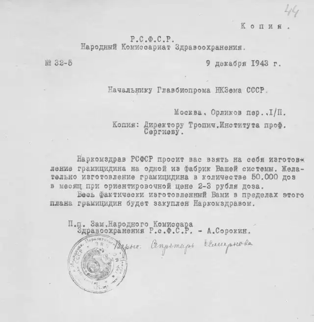 Грамицидин С - это один из первых советских антибиотиков, который спас многие тысячи жизней во время Великой Отечественной войны. Именно этот препарат, который выпускался в виде пасты для наружного применения, не позволял раненным погибнуть от инфекций и ожогов, убивая опасные стафилококковые и стрептококковые бактерии. Предлагаем вам ознакомиться с архивными документами, связанными с созданием и производством этого важнейшего в годы войны лекарства.