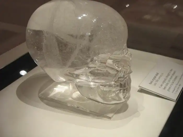 Хрустальный череп в Британском музее. На карточке с описанием написано: «Череп из горного хрусталя. Конец 19-го века нашей эры. Первоначально считалось, что это ацтек, но последние исследования доказывают, что он европейский». Источник изображения: flickr.com