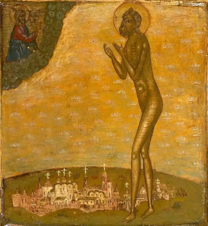Недавний католик так проникся духом православия, красотой обряда и убранством церквей, что раздал имущество и товары, принял крещение, иноческий постриг, а затем «сам во юродство претворися и облечеся в раздранныя и непотребный ризы». Таким образом, иностранец постиг идею подвига юродства: внешнее, красота – ничто, спасение души и нравственность – всё.