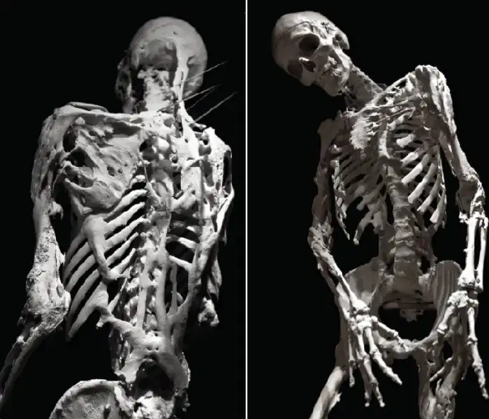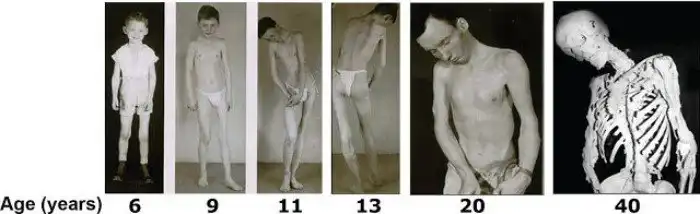 Сложно сказать, что бы стало с такими пациентами на территории Европы в ранее Средневековье, эпоху религиозных войн или период расцвета инквизиции. Так, например, в 1744 году для медицинского осмотра тела, напугавшего врачей, привлекли даже служителей церкви. Преподобный Дин Копинг вместе с епископом Робертом Р.Р. и Чарльзом Смитом осматривали скелет умершего от фибродисплазии, испытывая одновременно религиозный трепет и собственное мужество на прочность. Из известного описания мы можем выделить следующие моменты: весь скелет представляет из себя цельную, не распадающуюся и несгибаемую структуру. Лопатки срослись в пластину, от костей бедер отходят гребни и шипы, напоминающие побеги коралла или ветви жуткого растения, длинной они достигают от 8 до 9 дюймов. Из задней части пяточных костей вырастают шпоры. Массивные деформированные челюсти удалось открыть только ножом. Болезнь настигла мужчину в возрасте 18 лет и к 60 забрала его жизнь.