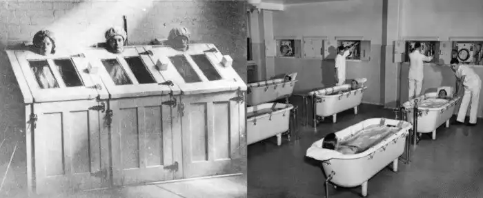 В общем, к концу 19-го века таких энтузиастов купальных терапий стало пруд пруди. Не самый мой удачный каламбур, ну да ладно... Процедуры логично разделили на две части: горячие ванны и холодные. Горячие помогали потеть и, соответственно, обосновывались выводом плохих жижей из организма. Холодные тормозили жизнедеятельность тела и предотвращали приток вредоносных "жиж" в голову. Применительно к психиатрии это означало принудительное помещение пациентов в паровые шкафы, приём длительных многочасовых горячих ванн, когда близко к поверхности натягивали простынь, предотвращая всплытие, а самих пациентов связывали, помогая наладить перемещение жидкостей в теле, а с ними - баланс активности и буйства. Приём холодных ванн, ванн со льдом прописывали для лечения маниакально депрессивных психозов. Под холодной имеется ввиду температура в 15 градусов цельсия. Всё-таки это не моржевание, хотя бубенцы, как говориться в одной сказке, звенят.