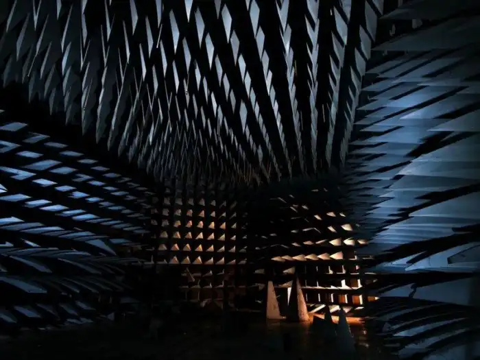 Эта камера создана из бетона толщиной 30 см, стекловолоконных метровых акустических платформ, а также звукоизолирующей стали из которой выполнены двойные стены. Внешняя стена покрыта специальным составом блокирующим электромагнитное излучение. Внутреннее покрытие камеры исполнено в форме треугольников из прорезиненной пены и способно гасить звук эха или шорох шагов. Принятые ухищрения привели к тому, что уровень звукопоглощения в камере приближается к отметке 99,9%.