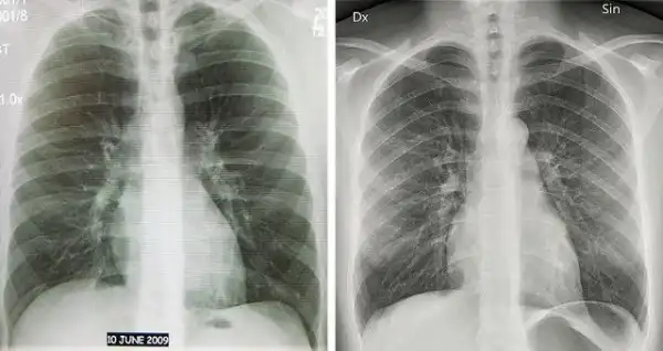 Рентген позволяет увидеть контуры легких, мягкие ткани, сердце, кровеносные сосуды и костные структуры.