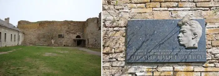 Двор Шлиссельбургской крепости, в котором были казнены заговорщики, и мемориальная доска на этом месте.