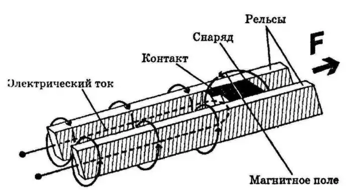 Рельсы подключены к мощному источнику электрического тока: один к положительному контакту, второй - к отрицательному. Пока пушка не заряжена, цепь не замкнута и ток по электродам не бежит.