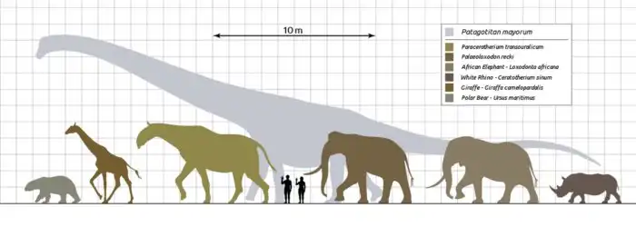 Для сравнения, самыми большими и тяжелыми млекопитающими когда-либо обитавшими на суше являются индрикотерии, достигавшие около 5 метров в высоту и массы в 17 тонн. Они жили примерно 20-30 млн лет назад во многих частях Азии и в основном питались листьями и ветвями.