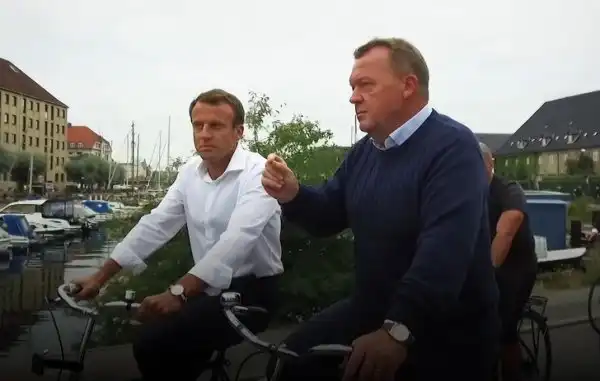 Президент Франции Эммануэль Макрон и бывший премьер-министр Дании Ларс Расмуссен на велосипедах.