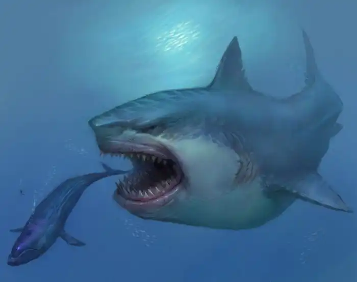 Как правило эта акула носит имя Мегалодон. Это была самая большая акула среди когда-либо существовавших. Достигая длины 18 метров он был почти в три четверти размера современного синего кита. Его зубы были такими же большими, как ваша рука или даже больше. И его челюсти были достаточно широкими, чтобы проглотить человека целиком.