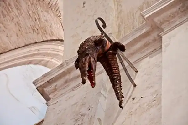 Также можно найти несколько крокодилов в Италии. Один из них находится в Святилище пресвятой девы Марии Милосердной, которое располагается в городе Куртатоне. Чучело рептилии висит под крышей храма уже 500 лет, напоминая прихожанам о том, как близки силы зла.