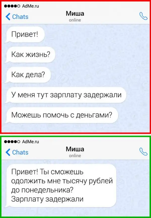 Постоянные уведомления на телефоне о каждом слове, которое набрано отдельным сообщением, действуют на нервы и отвлекают. Особенно такой стиль неуместен в деловой переписке. Если вы знаете, что хотите написать, не поленитесь сначала сформулировать в своей голове мысль, а затем изложить ее в одном сообщении.