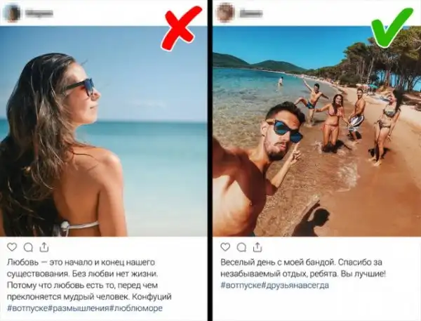Когда-то такие фотографии, возможно, и смотрелись оригинально. Сегодня мода на любительские постановочные снимки прошла. Фото, на котором вы многозначительно смотрите куда-то в сторону, — не всегда удачное решение. Часто подобные посты сопровождаются мудрыми цитатами, не имеющими никакого отношения к самой картинке.