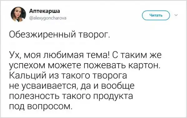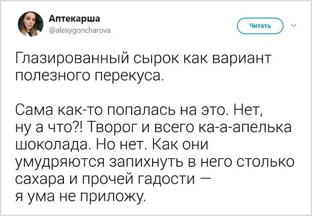 Александра Гончарова работает доктором, а в свободное время она занимается просветительской деятельностью в социальных сетях. Девушка, выбрав себе никнейм "Аптекарша", решила развеять антинаучные мифы о здоровом питании, в которые верят множество людей. Давайте посмотрим, что рассказывает Александра и узнаем, так ли полезен глазурованный сырок в качестве полезного перекуса.