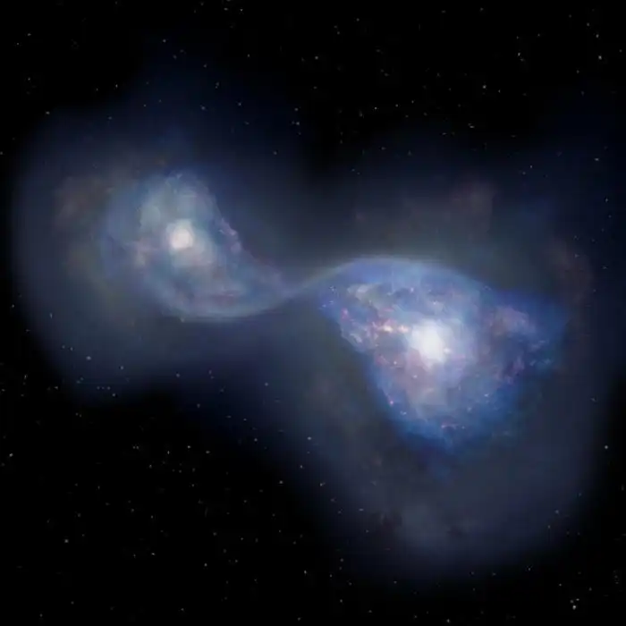 Каждый из его компонентов в десятки раз больше Млечного Пути, диаметр которого составляет 100 тысяч световых лет. Эти два тела разделены на 30 тысяч световых лет и каждую секунду увеличиваются на сотни километров. В результате создается довольно необычное слияние.