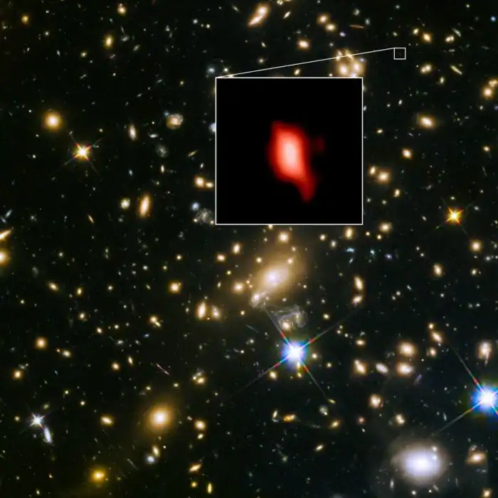 Галактика со старыми звездамиДругим интересным объектом на краю Вселенной стала галактика MACS1149-JD1. В ней астрономы обнаружили слабый поток ионизированного кислорода в 13,3 миллиардах световых лет от нас. Пучок газа очень красный, поскольку свет был растянут во время долгой жизни, которая началась 500 миллионов лет после Большого взрыва.