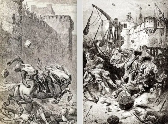 Во время осады крестоносцами Тулузы был убит их предводитель граф Симон де Монфор (ему в голову угодил камень из камнеметательной машины). Защитники города встретили это известие бурной радостью. Трубадур Гийом Тудельский, автор «Песни об Альбигойском крестовом походе» описал это так: