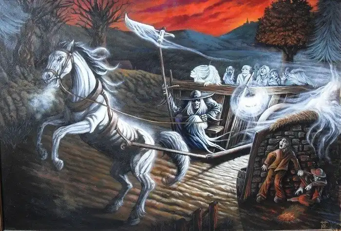 Гильтине – богиня смерти и чумы - была молодой привлекательной женщиной, которую погребли заживо. Когда через 7 лет ей удалось выбраться из могилы, она стала страшной старухой с длинным синим носом и ядовитым языком, которым она облизывала обречённых на смерть. Гильтине часто изображают как скелет с косой, а ещё она может превращаться в змею. Гильтине бродит по кладбищам, облачённая в саван, и облизывает трупы, чтобы извлечь яд, которым она будет убивать живых.