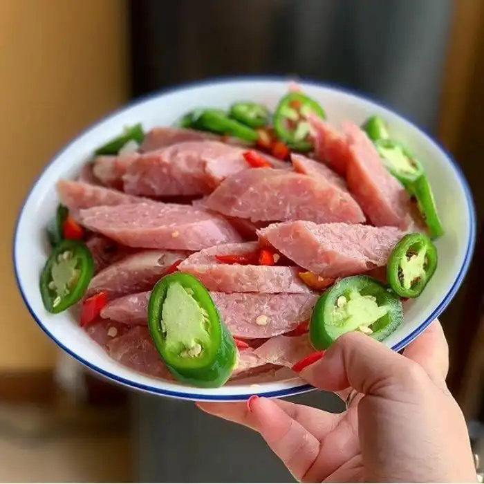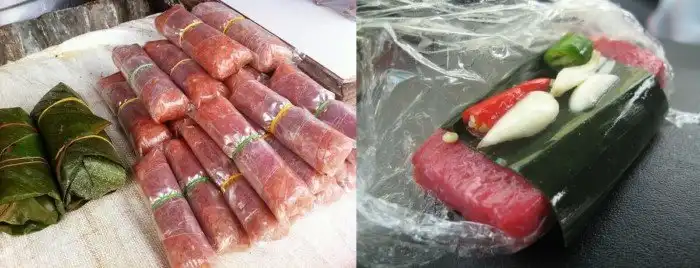 Оно действительно готовится из сырой свинины и измельченной свиной шкурки. В качестве топпинга и упаковки используют тонкий слой листьев звездного крыжовника, гуавы или фиговых. Эти листья содержат натуральный кислый агент, вызывающий естественное закисание сырой свинины, что делает ее съедобной (по мнению местных) через несколько дней. Как праздничное блюдо, оно широко используется в традиционных ритуалах во Вьетнаме, на свадьбах и в качестве подношений на алтарях.