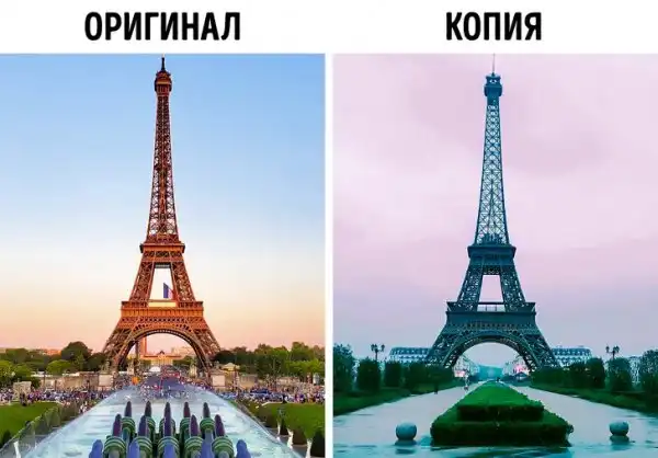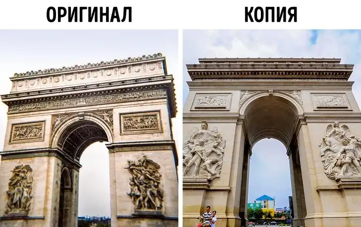 Триумфальная арка в Париже была построена в XIX веке в память о тех, кто сражался в наполеоновских войнах. Ее высота составляет 50 м, в то время как китайская копия в Тяньдучэне чуть выше 10 м.