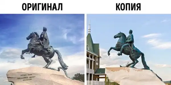 В парке находятся не только копии зданий, но и несколько известных скульптур из разных городов России. Кроме «Медного всадника», здесь можно найти и памятники Пушкину, Тургеневу, Гагарину, а также скульптуру «Рабочий и колхозница» и уменьшенную копию монумента «Родина-мать».