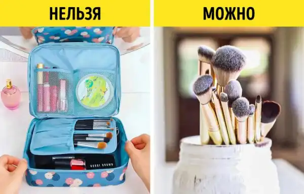 Косметичка — благотворная среда для размножения бактерий. Все те кисти и спонжи, что мы храним где-то на ее дне, становятся домом для микробов, которые могут вызывать кожные инфекции и пищевые отравления, инфекции кровотока и пневмонию. Поэтому стоит завести отдельное место для косметических аксессуаров и чаще очищать их от косметики.