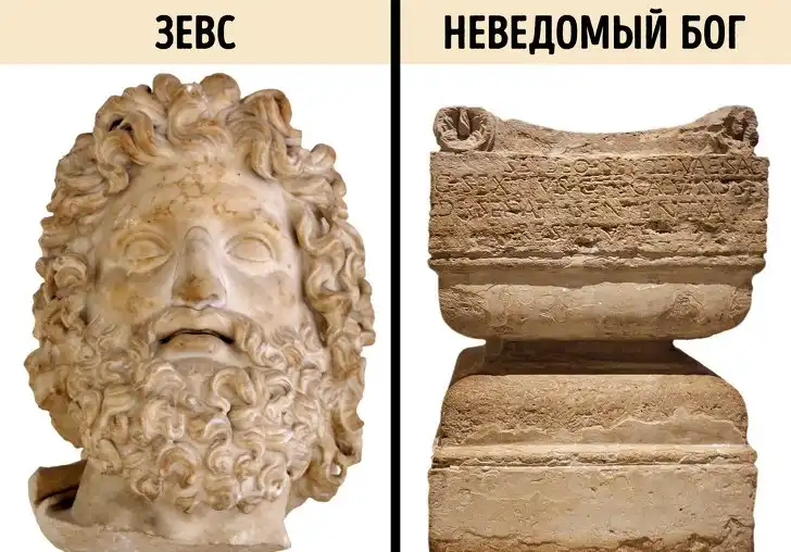 - В 1913 году немецкий теолог Эдуард Норден предположил, что помимо 12 «основных» богов и большого количества божеств «помельче», греки поклонялись неведомому богу. Основанием для такого вывода, помимо всего прочего, послужили тексты Геродота. Он писал, что когда-то афиняне приносили жертвы всем небесным покровителям, кроме Пана, который, согласно историку, разозлился на них. Чтобы избежать подобного впредь, они стали делать алтари божеству, чьего имени они не знали. Надписи на них гласили «я знаю бога».