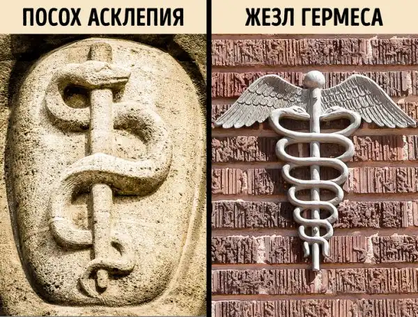 - Посох Асклепия — известный издревле символ медицины, пришедший из Древней Греции. Однако в Соединенных Штатах Америки и некоторых других странах врачебные организации зачастую изображают вместо него жезл Гермеса, который также называют кадуцеем. Эти эмблемы очень похожи, однако посох обвивает одна змея, а кадуцей — уже две. Путаница возникла в 1902 году — тогда по настоянию одного из офицеров, который по незнанию перепутал символы, его приняли в качестве знака Медицинской службы армии США.