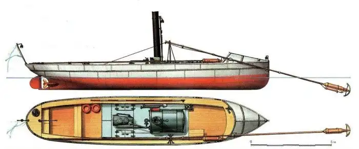 Как известно, первая относительно действенная атака на корабль при помощи такого минного корабля произошла во время гражданской войны в Америке. Северяне наскоро оборудовали паровой баркас шестом с вынесенной на максимально возможную дальность миной (сколько получилось без потери возможности двигаться и маневрировать) и атаковали броненосец южан. Броненосец потопили, но и сами ушли в воронку, которая образовалась на месте его гибели – слишком близко находился носитель оружия к точке взрыва, и уйти ему на безопасное расстояние особого шанса не было. Поэтому разработку вполне жизнеспособной самодвижущейся мины Уайтхеда, способной оставлять носителя оружия на безопасной дистанции, восприняли с энтузиазмом – это 1868 год.