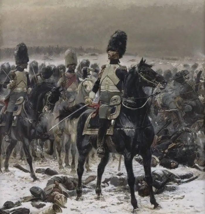 Генерал Луи Лепик (известный фразой: "Выше головы, господа, это всего лишь картечь, а не дерьмо") во главе конных гренадер в битве при Прейсиш-Эйлау, февраль 1807. Художник: Édouard Detaille