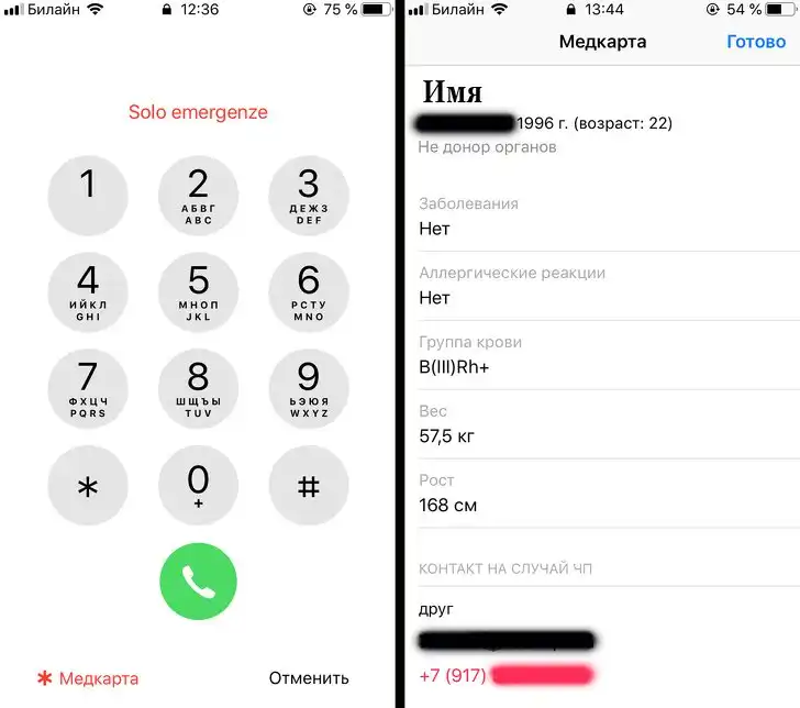 На такие случаи на айфоне есть волшебная кнопка, о которой мало кто знает: «Медкарта». Просмотреть ее можно без ввода кода-пароля телефона. Заполнить карту просто: Здоровье — Медкарта — Создать медкарту. Заполняете все разделы и включаете переключатель «На заблокированном экране». Данные лучше вводить на латыни — так их прочтет любой врач.