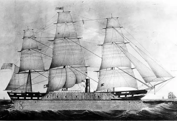 Фрегат "Мерримак", спущенный в 1855 году, шел головным в серии. Его даже в какой-то мере расценивали как эталонный, показательный корабль, который отправили покорять сердца европейцев и демонстрировать им достижения новосветской промышленности. Что он с успехом и выполнил, собрав свою долю восторгов во Франции и Британии.