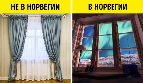 Норвежцы любят повторять, что скрывать им нечего. Именно поэтому у них нет штор на окнах. Когда темнеет, то, прогуливаясь по улицам, можно невольно наблюдать за тем, что происходит в домах: вот в этом доме сели ужинать, в этом — смотрят телевизор, а в том — играют с детьми. Здесь горит камин, там на стене висят фотографии, а вон там стоит рояль.