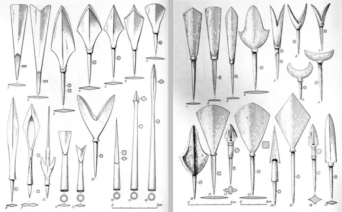 Для стрельбы по лошадям и незащищённым целям использовались широкие и плоские «срезни». Стрелы с толстыми долотообразными наконечниками применялись для раскалывания щитов. Острые гранёные наконечники назывались бронебойными, они могли пробивать как кольчужные, так и пластинчатые доспехи.