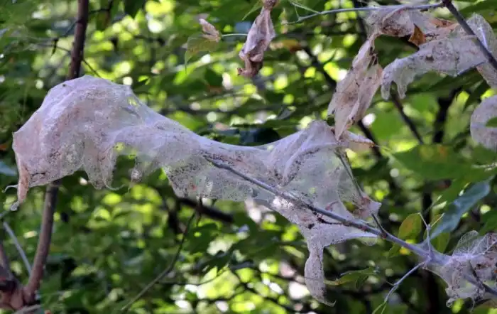 Ветка дерева, опутанная паутиной вредителя. www.odessa-life.od.ua ©