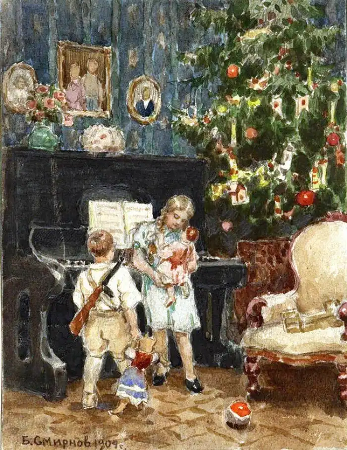 Художник Борис Васильевич Смирнов (1881–1954) много путешествовал по стране. В 1904 году он с тюремным этапом проделал путь из западной части России по территории Сибири. В это время он создал серию рисунков и акварелей с изображением людей и мест, встречавшихся ему в дороге. Среди них был этот акварельный рисунок, который называется "Ёлка в богатом доме Иркутска".