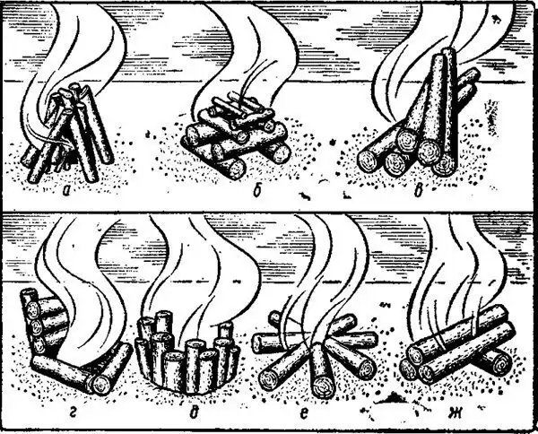 Г) "Американский камин": под углом к земле вбивают два толстых кола, к которым прислоняют стенкой положенные друг на друга поленья. Располагают стенку так, чтобы ветер дул на нее. Перед стенкой, с заветренной стороны, разводят костер.