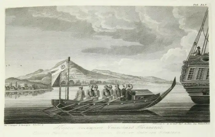 Резанов на борту шлюпа "Надежда" встречает японскую делегацию