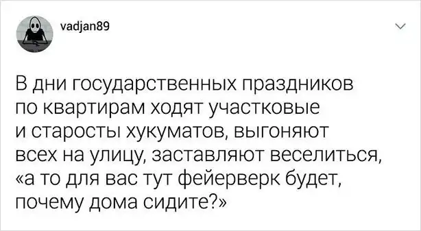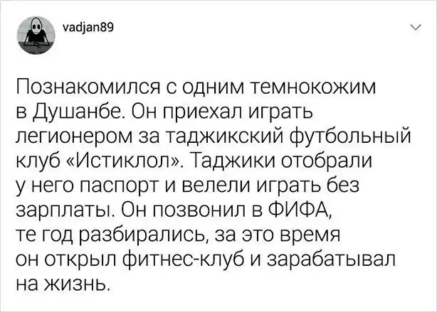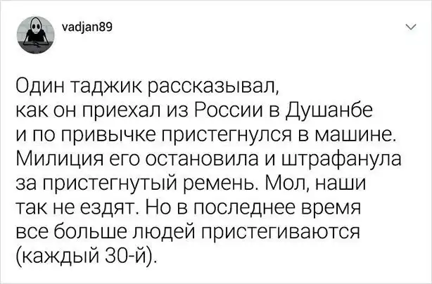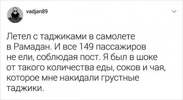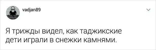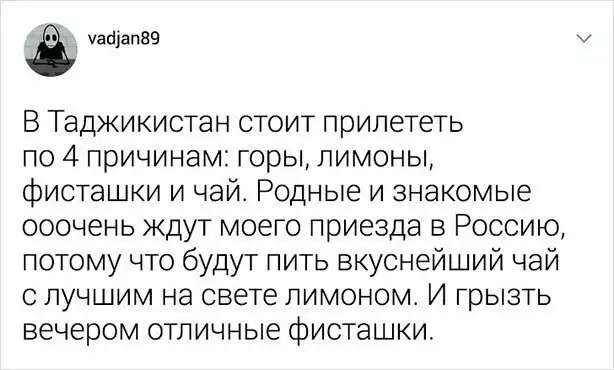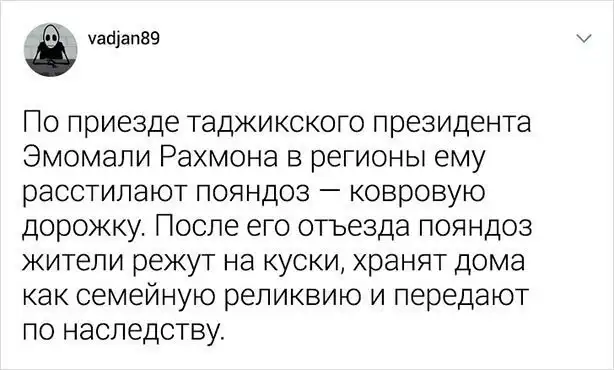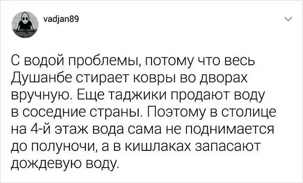 Пользователь твиттера "vadjan89" родился в России, но уже много лет живет в Таджикистане. За время проживания в этой стране он познакомился с множеством непривычных традиций, которые бы шокировали любого европейца. Свои мысли и наблюдения он публикует в твиттере.