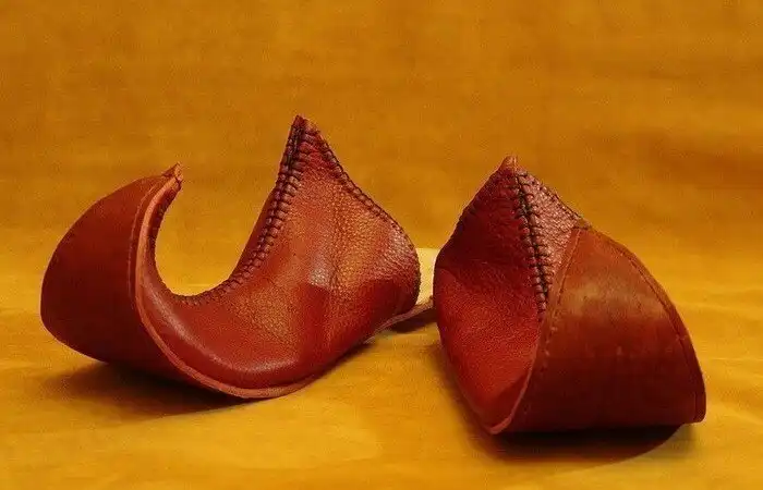 Интересный факт: исследователь Вольфганг Брун в своем труде «История костюма от древности до наших дней» утверждает, что остроконечные ботинки на мягкой подложке были придуманы именно в Индии, в первую очередь буддистами. Якобы такие ботинки почти не портили траву. Кроме того, на них вешались колокольчики, дабы отпугивать от идущего насекомых и мелких гадов, что очень в духе буддизма.