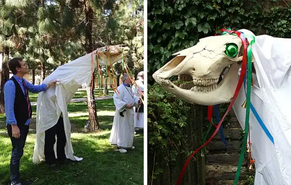 Необычная рождественская традиция существует в Южном Уэльсе с 1800 года. Человека облачают в белый балахон, дают в руки палку, на которой закреплен лошадиный череп, украшенный лентами и стеклышками. В таком костюме человек ходит по городу, поет песни и собирает угощения.