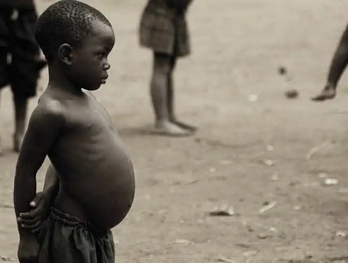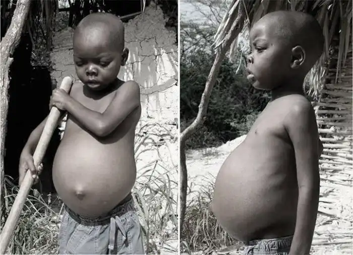 На самом деле - нет, не обязательно. Когда у детей появляется такой тип раздутого живота, это называют «квашиоркор». Это форма недоедания, при которой имеет место быть серьезный дефицит белка. Такое состояние возникает когда ребенок потребляет достаточное количество калорий (в основном за счет углеводов), но при этом практически полностью отстутствует белок в рационе.