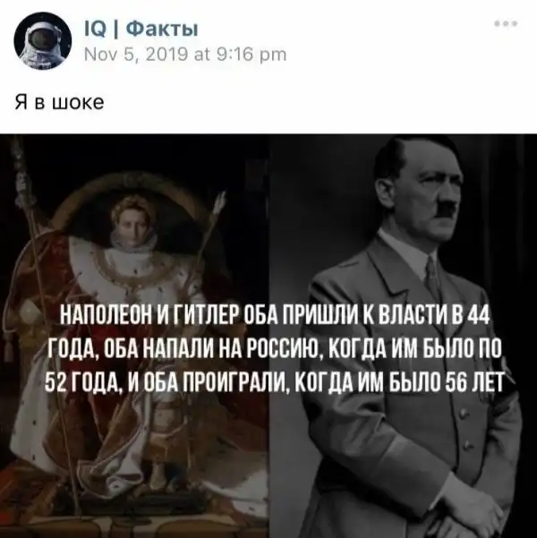 Полная чушь - к власти Наполеон пришел в 34 года, Гитлер в 43, с Россией первый начал войну в 42, второй в 52, первый отрекся от престола в 44 года, второй умер в 56