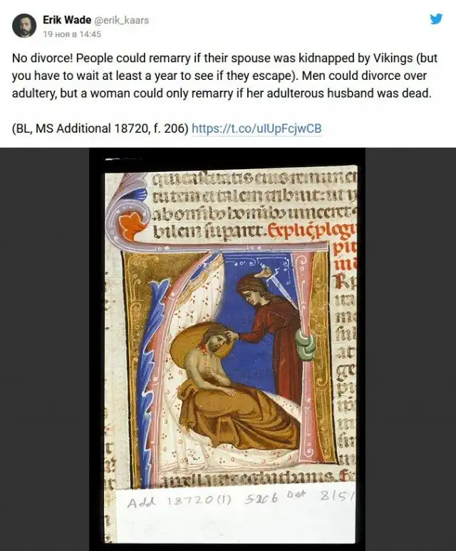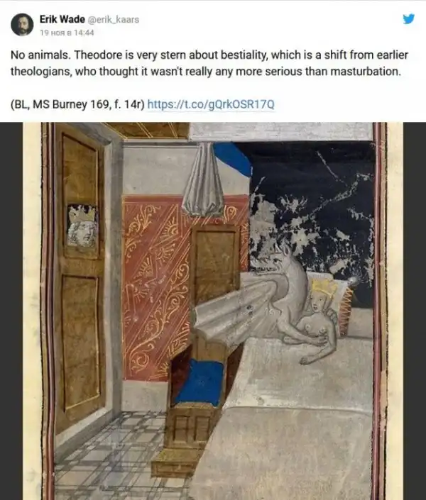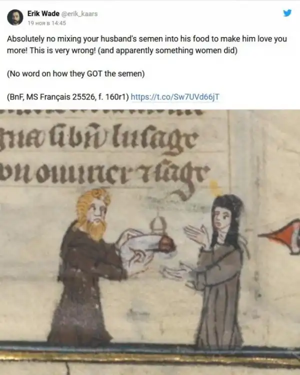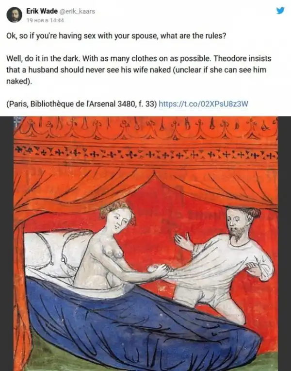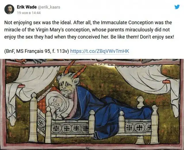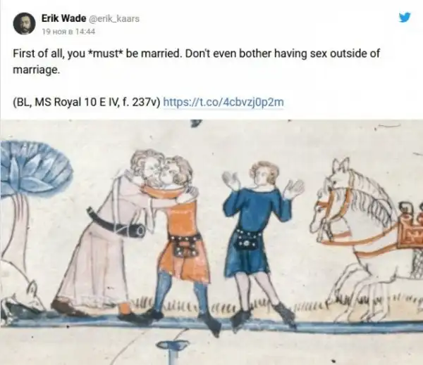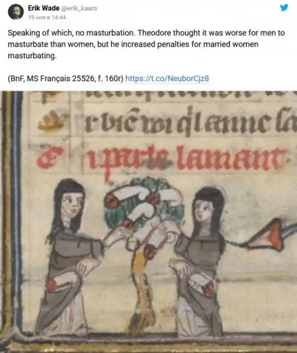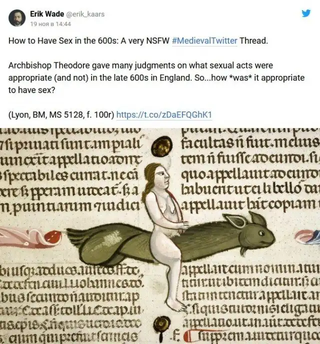 В ноябре Вейд рассказал о том, какие в Средневековье существовали рекомендации по поводу занятия сексом. В треде он ссылается на английского архиепископа Теодора, который жил в седьмом веке и составил правила того, как «уместно» заниматься сексом. Рассказ историк подкрепил реальными иллюстрациями тех времён.