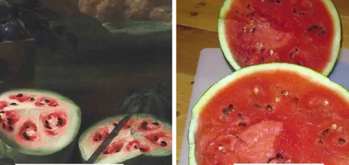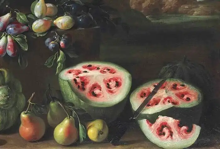 Таким арбуз изображен на картине художника XVII века Джованни Станци. Как мы видим, арбузы, какими их создала природа, имеют толстую корку и очень мало красной мякоти.