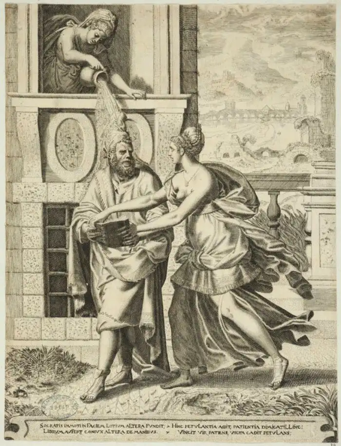 Ксантиппа с кнутом и уздечкой «верхом» на Сократе