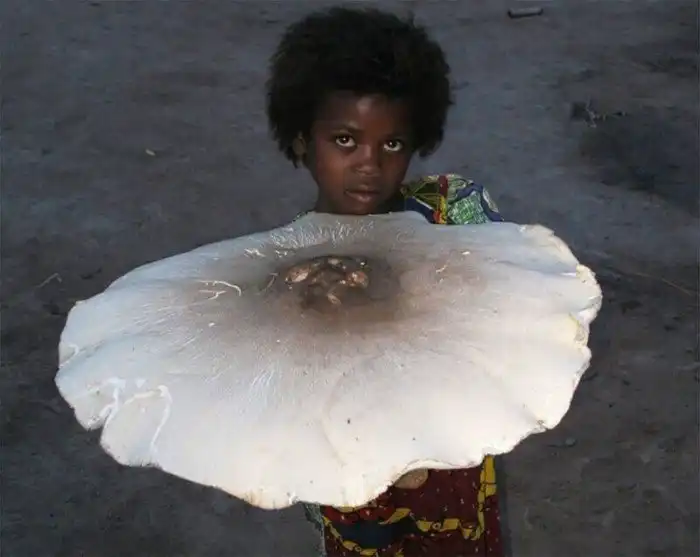 Белый зонтик в руках этой африканской девочки — термитомицес титанический (Termitomyces titanicus), считающийся самым большим съедобным грибом в мире. Диаметр шляпок этого гриба, встречающегося в Замбии и сопредельных регионах, составляет 40–60 см, а в отдельных случаях может достигать одного метра. Вес шестидесятисантиметровых экземпляров превышает 2 кг.