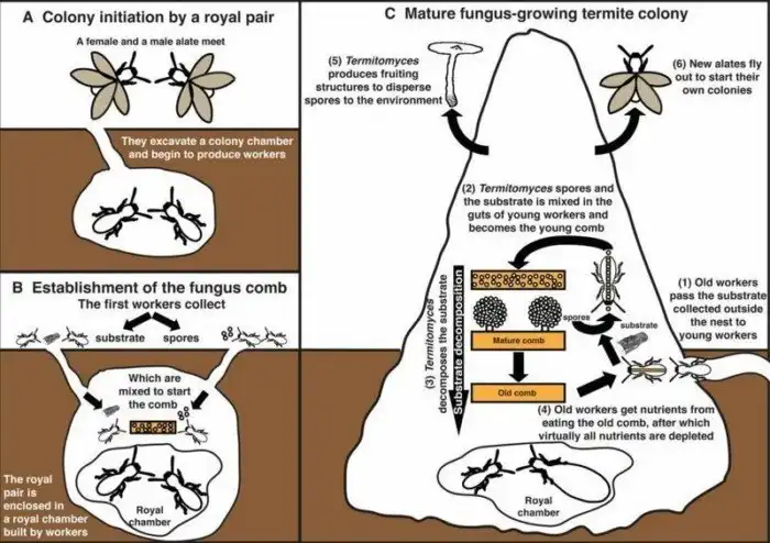 Действительно, появление плодовых тел термитомицетов синхронизировано с вылетом крылатых самцов и самок, которым предстоит стать основателями новых гнезд. Когда базидиоспоры (споры полового размножения), высыпающиеся из плодовых тел, попадают во внешнюю среду, их подбирают термиты-рабочие из вновь основанного гнезда, чтобы заложить в нем грибную плантацию. Таким образом, в момент спороношения и брачного полета контакт между термитами и грибами ненадолго размыкается, как бы в напоминание об их былой независимости. Существует лишь несколько исключений, когда крылатые самки термитов переносят термитомицесы в своем кишечнике. Напротив, молодые самки других насекомых-фермеров, таких как муравьи Attini и амброзиевые жуки, берут с собой симбиотические грибы в обязательном порядке.
