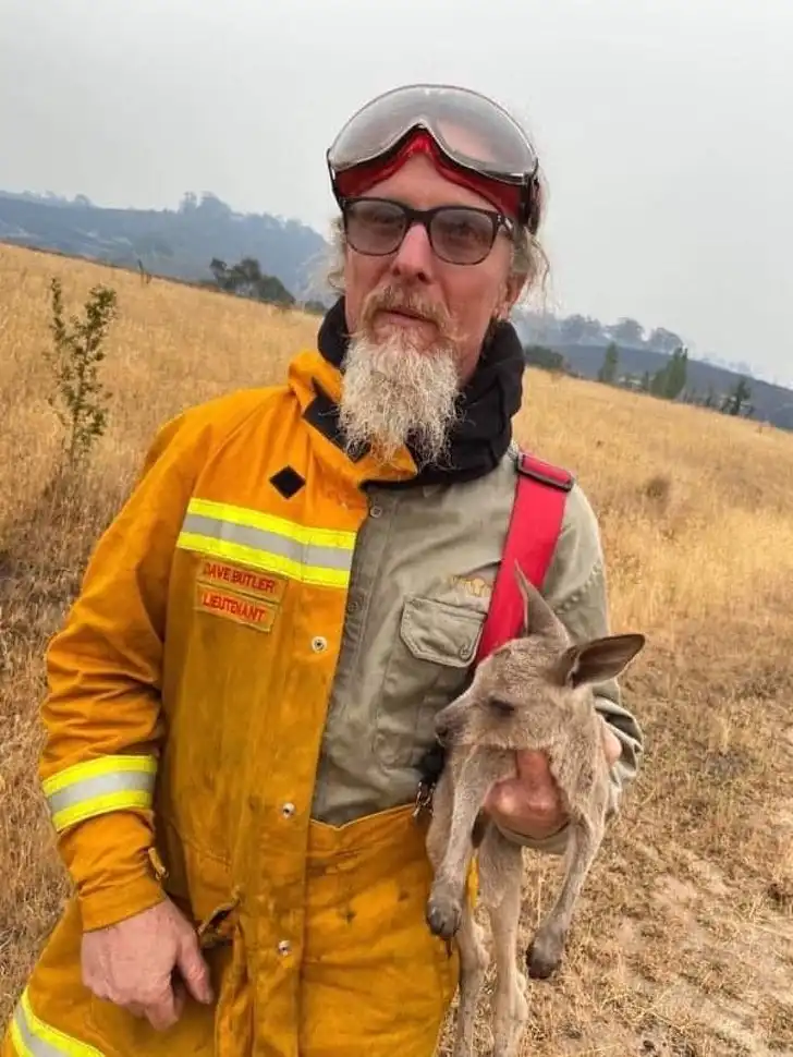 14. Лейтенант Дейв Батлер, который борется с пожарами в штате Виктория, со спасенным кенгуренком