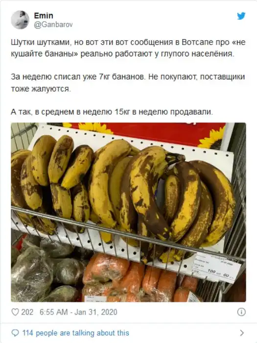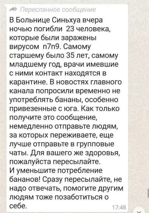 В WhatsApp среди тех, кто постоянно делает рассылки 10 своим контактам, чтобы не умереть или не заболеть раком, стала популярна рассылка про заражённые вирусом бананы на прилавках российских магазинов.