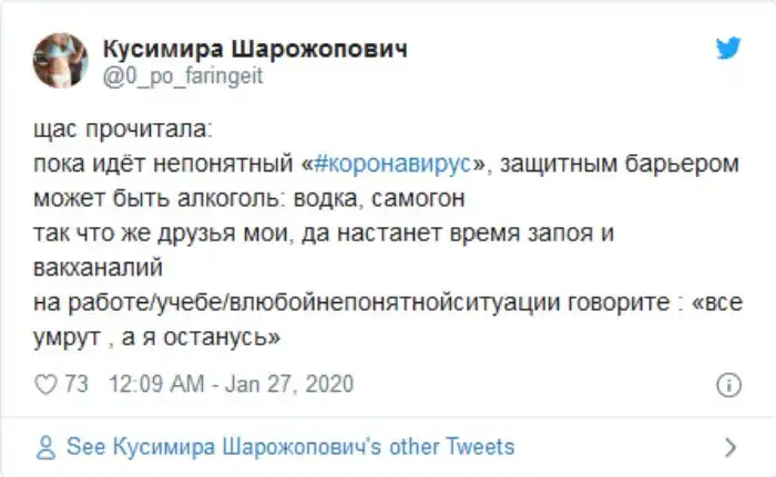 Также по соцсетям разошлась информация, что коронавирус лечится алкоголем. Говорят, что в пожилые китайцы охотно верят утке и регулярно лечатся алкоголем.