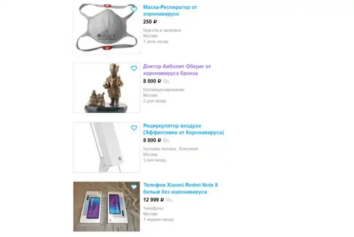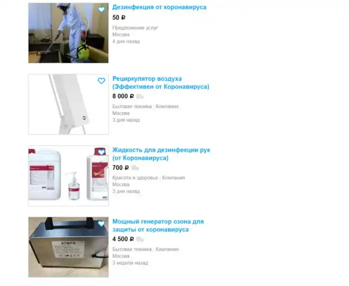 По ТВ рекламируют лекарство-пустышку, которое якобы "активно даже против коронавируса", а на сайте объявлений всего за 50 руб. предлагают продезинфицировать вашу квартиру от китайской заразы и продают "эффективный от Коронавируса" рециркулятор воздуха.